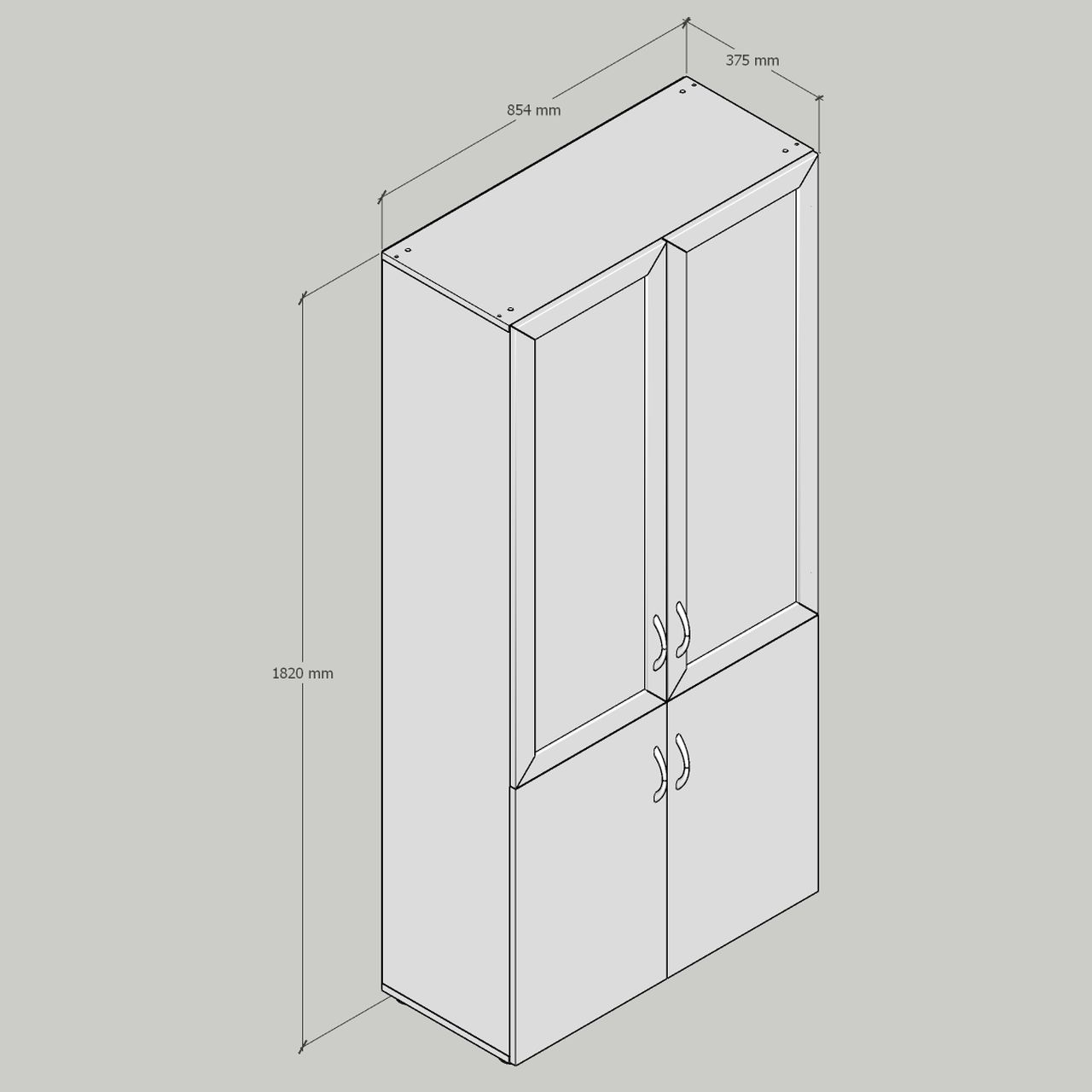 Шкаф изготовлен из ЛДСП толщиной 16 мм, отделан кантом ПВХ 0,4 мм. Размер 854х375х1820 мм. Задняя стенка изготовлена из ламинированного МДФ, толщиной 3,2 мм, в цвет ДСП из двух частей, которые соединяются между собой с помощью специального армированного скотча. Крепится задняя стенка гвоздями. Верхняя половина закрывается стеклянными дверями в раме из МДФ, нижняя – дверями из ЛДСП. Шкафы в декоре «Белый» и «Серый» поставляются со стеклянными дверями БЕЗ РАМЫ. Комплектуется четырьмя полками: одна врезная и три вкладных. Регулируемые опоры компенсируют неровности пола.